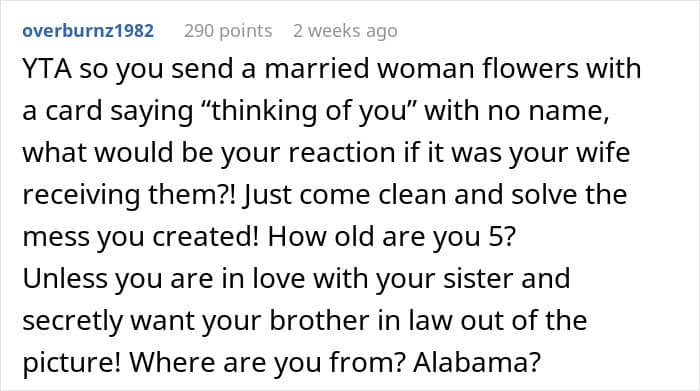 What’s your verdict on this one? Was the brother out of line for sending anonymous flowers, or did the husband overreact? Let us know your thoughts in the comments below!
