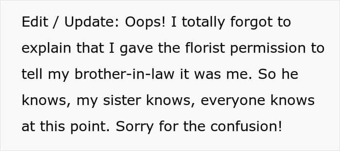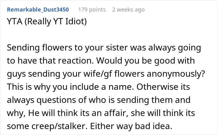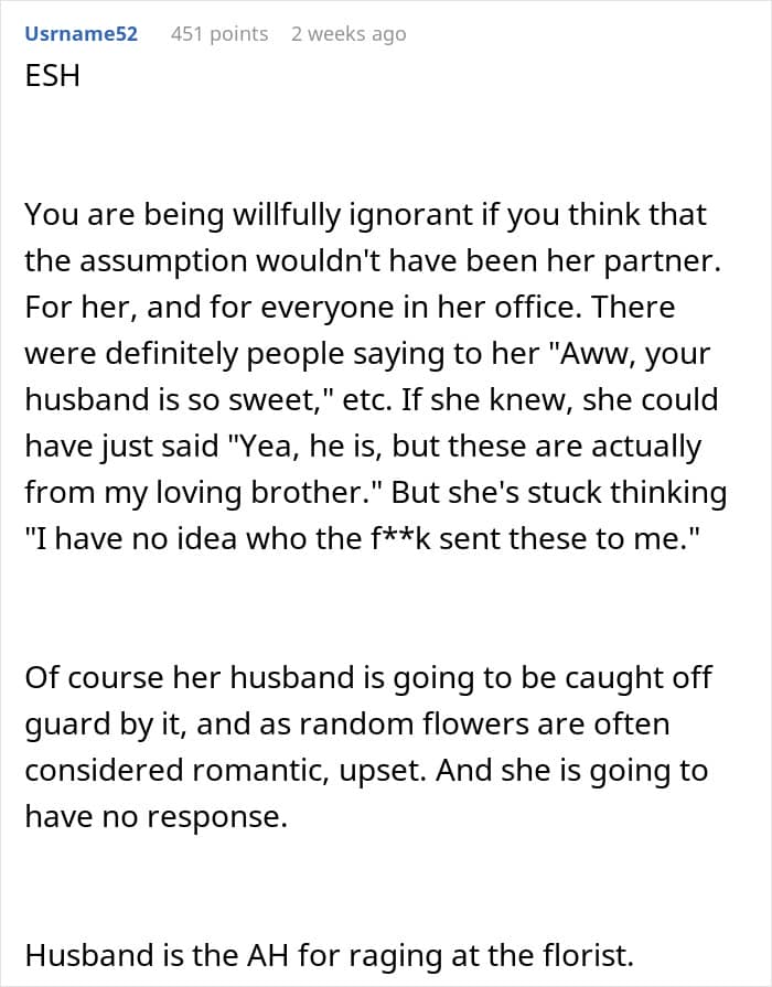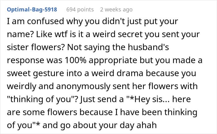 You’d think once the truth came out, that it was actually her brother who sent the flowers, it would be all smooth sailing, but nope. The sister, who was already feeling emotionally fragile, ended up fighting with her husband ever since the flower incident. So, our OP was left wondering if he should’ve just signed his name on the card to avoid the whole mess. His friends sure think so, and, to be honest, so do I.