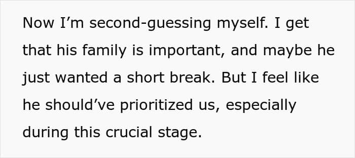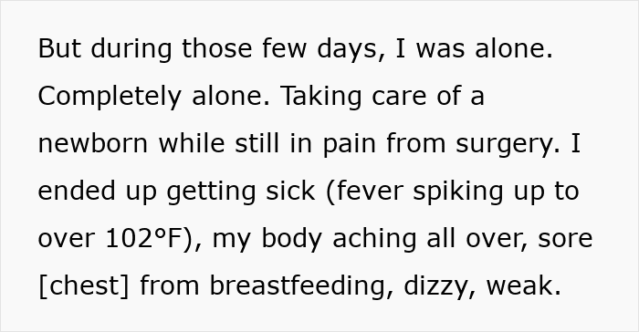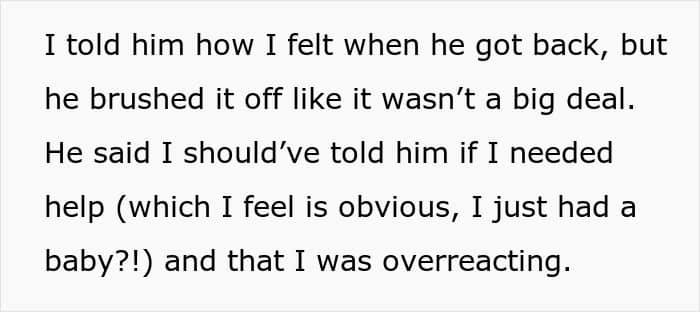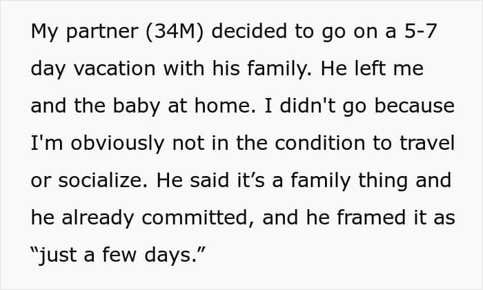 While the OP’s stitches were still healing, with her breasts working overtime and running on 2 hours of sleep, her partner decided it was the perfect time for a 7-day family vacation. Yup, he left the OP and their baby at home while he went to eat 3 meals a day and actually sleep through the night. I can almost hear moms everywhere screaming at the monitor.