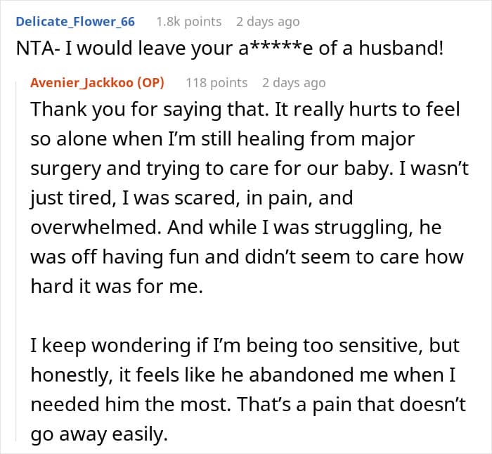 While he was off sipping something fruity, the OP spiked a fever and dealt with dizziness, aching stitches, a sore body, and the overwhelming chaos of newborn care. The poor woman was basically doing survival mode at home, while her partner was busy enjoying clean hotel sheets and zero responsibility.