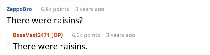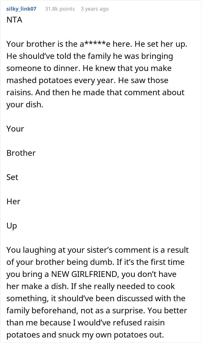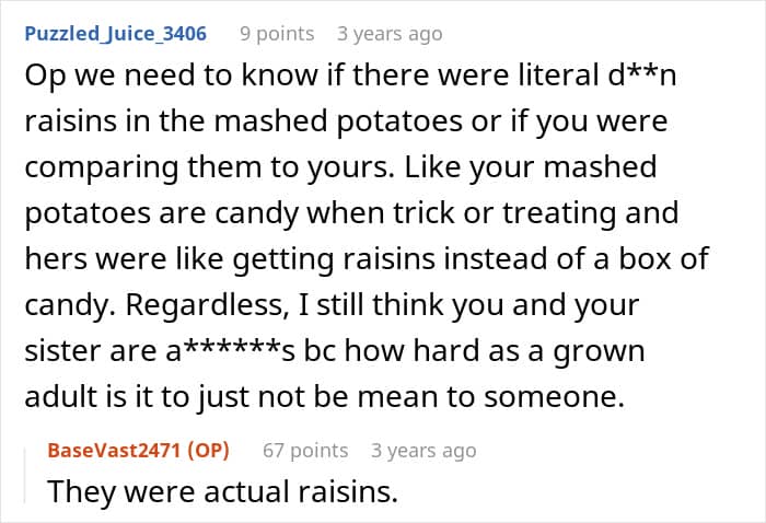 Things got dramatic after OP’s nephew spat them out on a tissue, and Chelsea tried to brush it off with a joke. Probably to cheer her up, John laughed and said that the family must be glad to have a break from the poster’s potatoes, and boy, did it trigger their other sister. She retorted with a monotonous voice, “We are not,” and OP couldn’t help but laugh out loud at this.