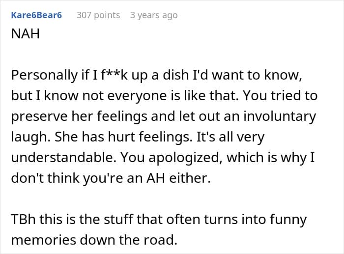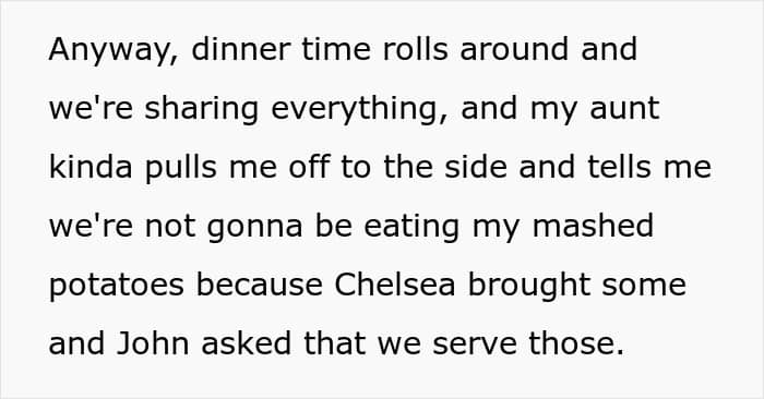 Now, the poster has always been making the mashed potatoes, but the family decided to serve the ones that Chelsea had cooked. However, when they dug into the food, everything was good apart from Chelsea’s dish. To keep things polite, nobody said anything bad, just smiled and muttered their “mmhhmms” for her sake.