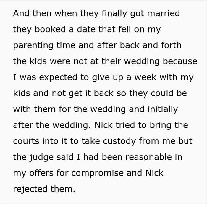 Nick also damaged things further by trying to make OP assign tasks to Hailey, like dropping off and picking up their children. Now, she was a complete stranger to them, and no parent would trust their kids with just anyone. Of course, the poster objected, but then, her ex took her to court. It’s hardly a surprise that the judge ruled in OP’s favor, as Nick was trying to alienate her.