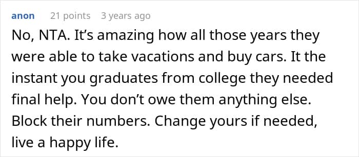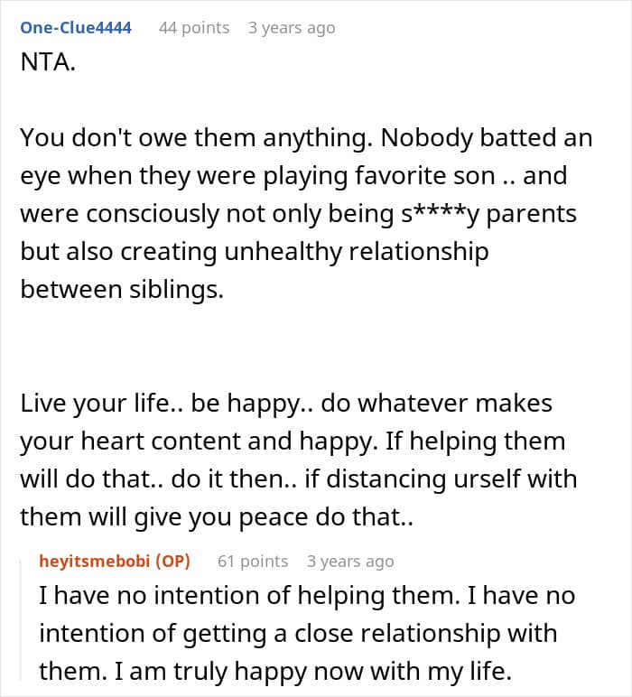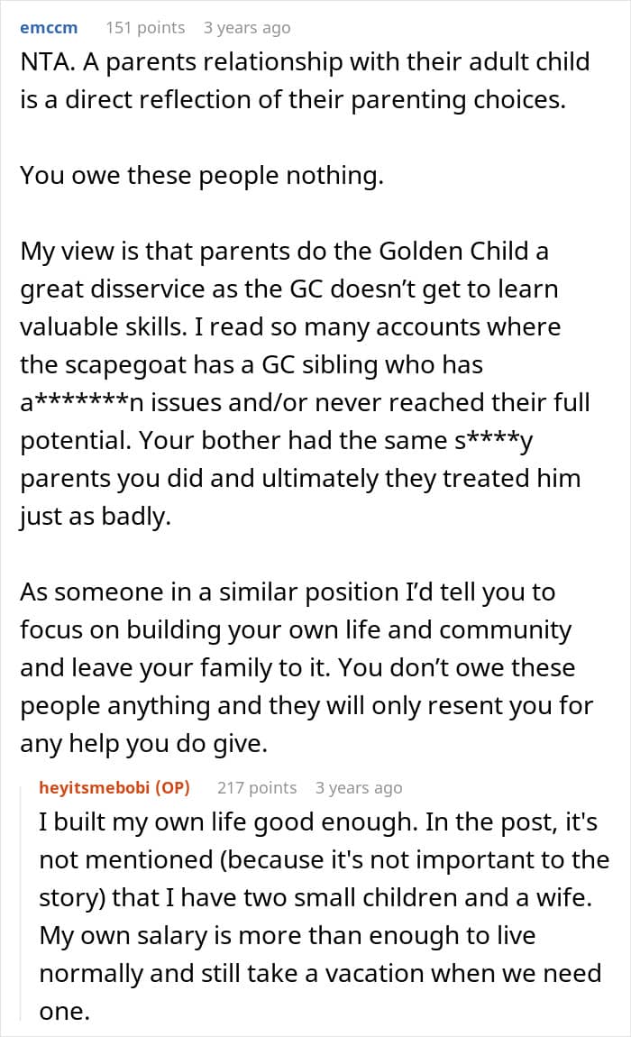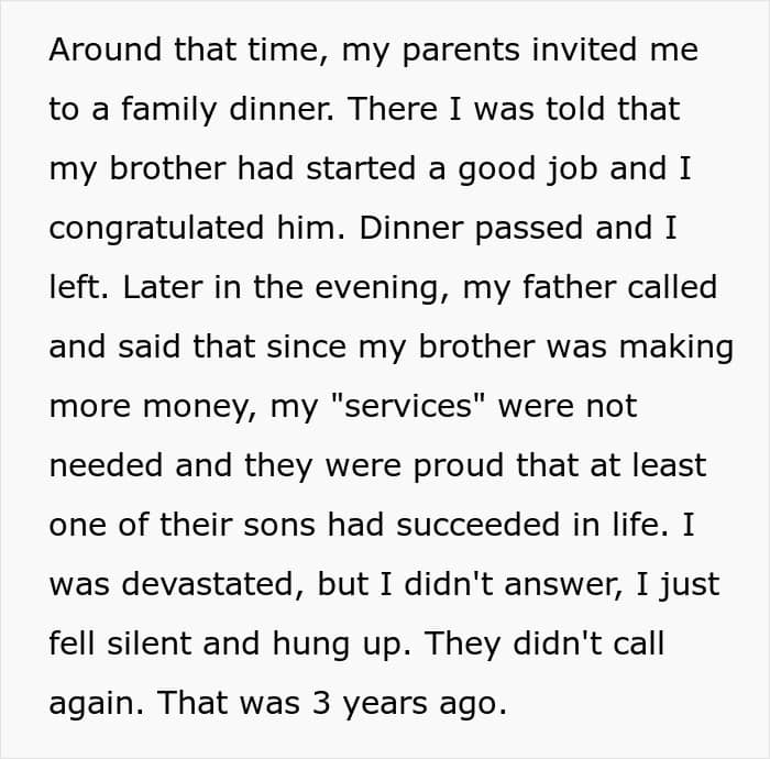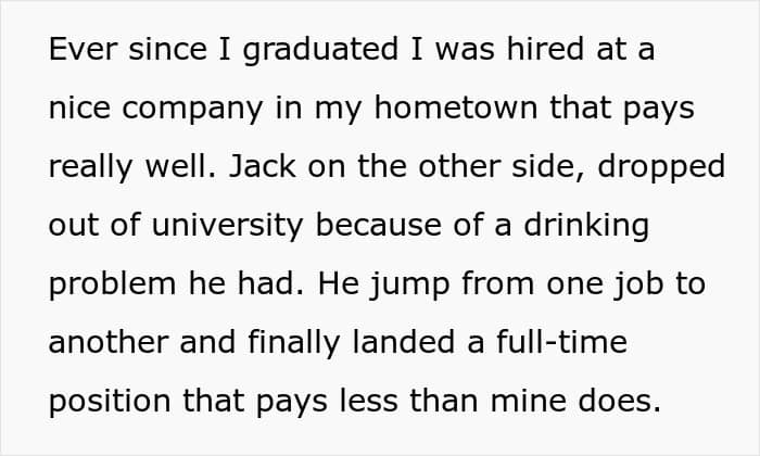 So did this man, until one day he had enough of his parents’ favoritism. He would send them money until one day the golden child, “Jack,” took his role. But, after “Jack” tanked his career and his finances, the parents ran back to their younger son. However, this time he refused to oblige and drew a hard boundary.