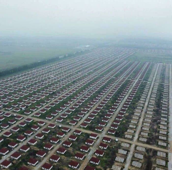 Rows upon endless rows of identical bland and monotonous, perfectly symmetrical houses in a newly opened countryside residential complex in North Korea.