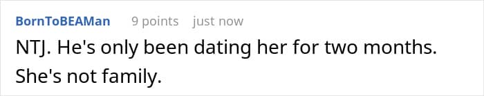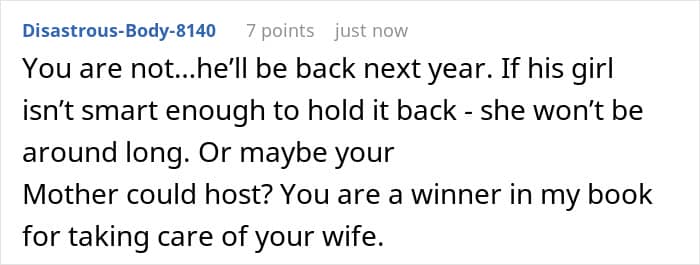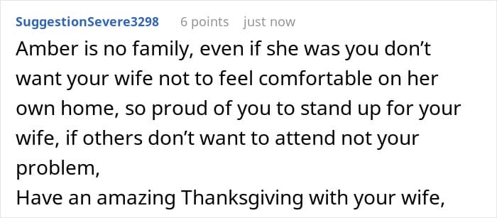 Netizens supported the OP, with many agreeing that he is right to exclude the girlfriend from Thanksgiving. Most emphasized that as the host, he has every right to decide who attends, and that his mother should stay out of it. Others echoed that it’s not unreasonable to protect his wife’s comfort, especially after the girlfriend’s disrespectful remark.