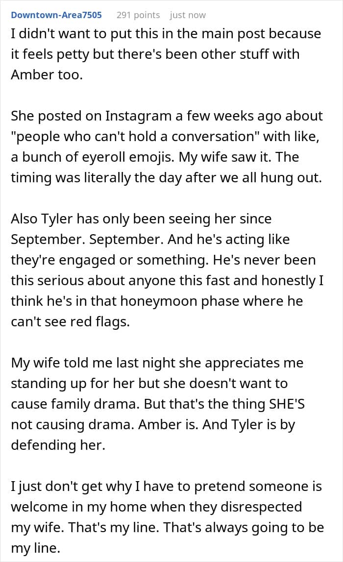 Their mother got involved, encouraging the OP to let it go for the sake of holiday harmony. Thebrother also threatened to skip Thanksgiving entirely if his girlfriend wasn’t invited; meanwhile, the OP’s wife tried to stay neutral, but he knew that the incident had hurt her feelings.