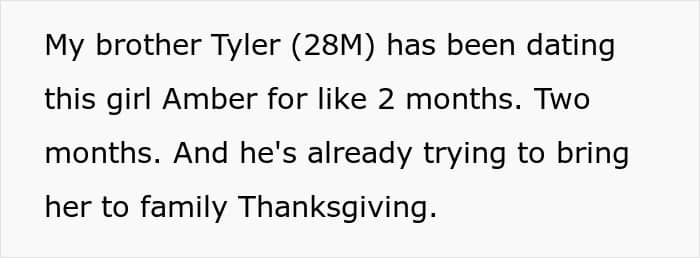 So when it was time for the Thanksgiving planning, the brother insisted on bringing his girlfriend since she’s “family now”. The OP, however, reminded him of the comment the girlfriend had made, and then mentioned that he would prefer it to be just close family this year. His brother reacted with anger, accusing him of overreacting and saying that the comment was just her making conversation.