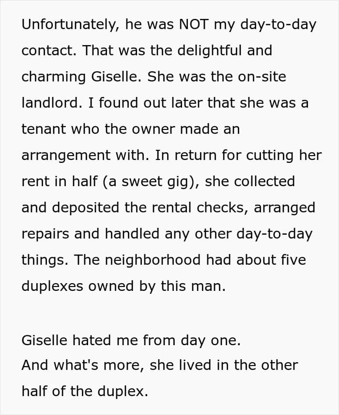 Renters are happier. With a good on-site manager, complaints and repairs can be handled more quickly, leading to the tenants wanting to either stay longer or prefer this property to others.Efficient maintenance and repairs. This one is especially relevant to this story. A professional on-site manager is supposed to handle complaints efficiently, regardless of how they feel about the tenant.They collect rent on time. The landlord himself might not be able to visit his property often, but an on-site manager has a much better chance of collecting rent from tenants by the due date simply because of their proximity to the renters.They might build stronger relationships with the tenants. Again, the opposite happened in this story, but this just shows how bad a property manager, “Giselle,” really is. Tenants rarely look at landlords as their friends because of the power dynamic. But a tenant who lives next to you and is sort of the landlord might seem much more relatable.A bad on-site manager might get a property owner in trouble
