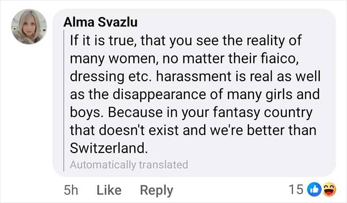 “If it is true, that you see the reality of many women, no matter their appearance, dressing etc. harassment is real as well as the disappearance of many girls and boys. Because in your fantasy country that doesn’t exist…” one wrote online.