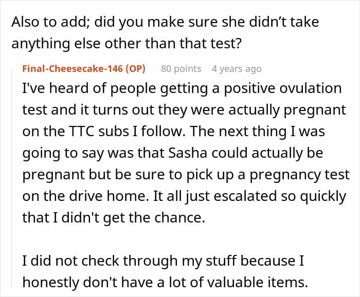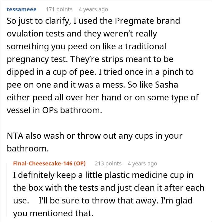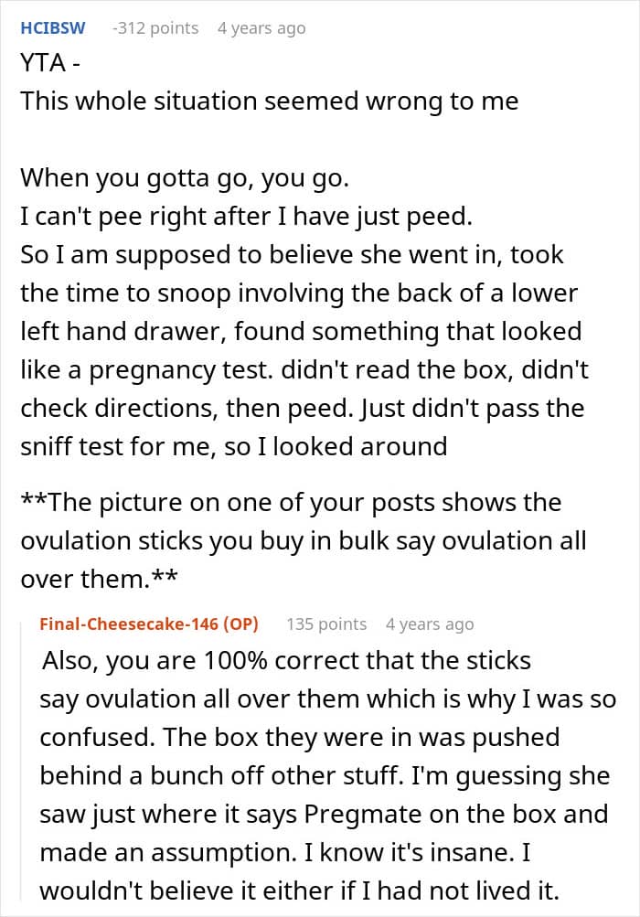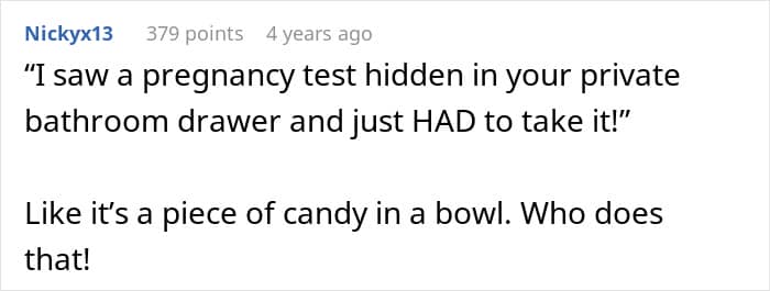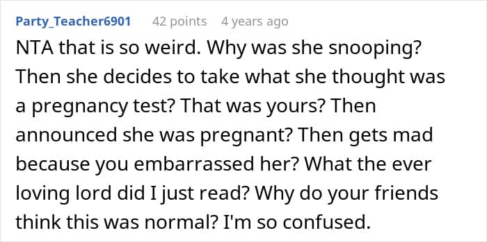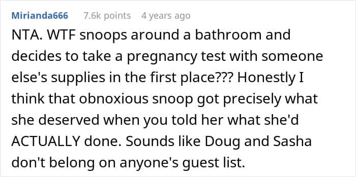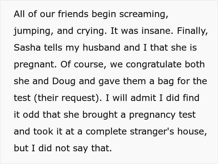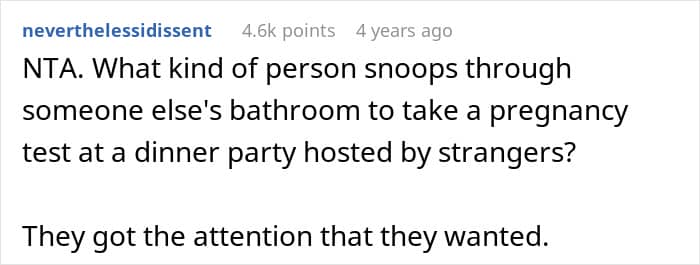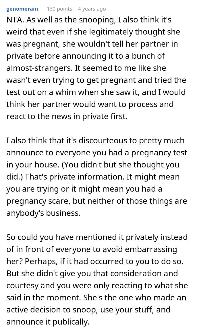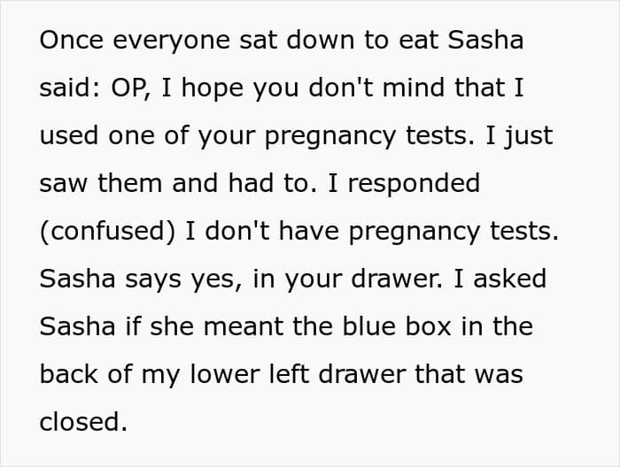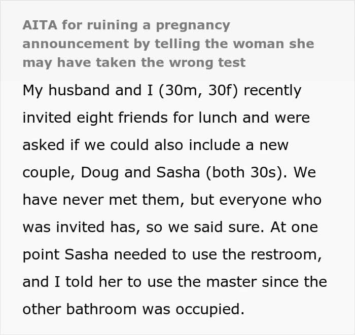 But one Redditor was taken aback when, during the lunch party she threw, a guest she hardly knew emotionally revealed she was expecting. The woman explained she’d just taken a test she found in the host’s bathroom drawer.