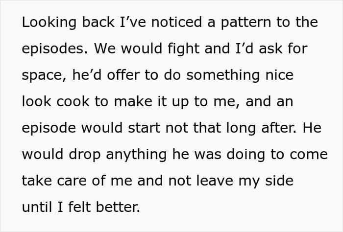 The author may have held onto this optimism after seeing her partner try to do something nice for her when she asked for space. Unfortunately, she didn’t see it as a manipulative tactic at the time.