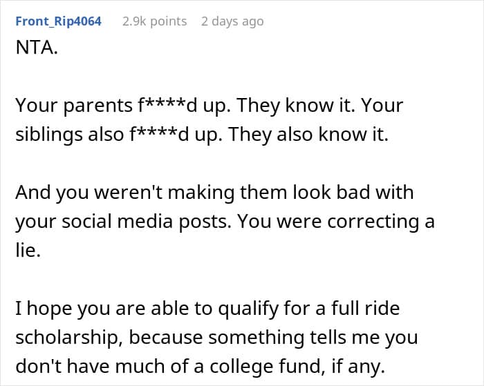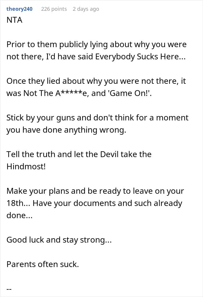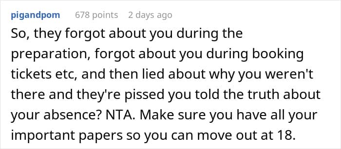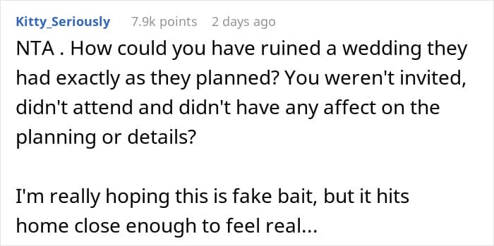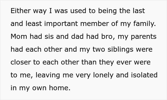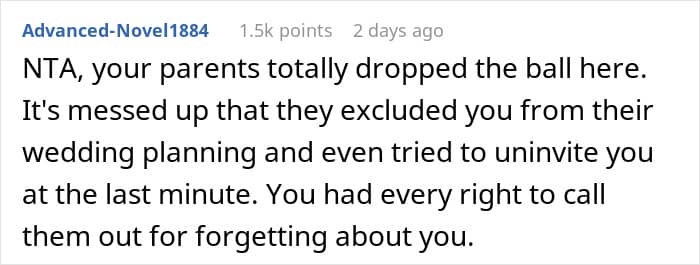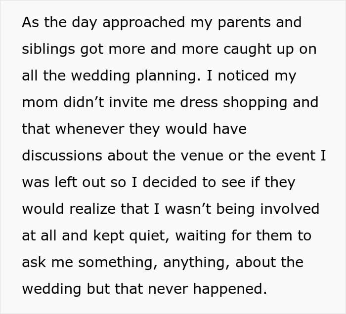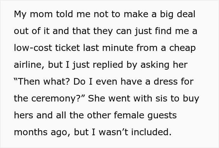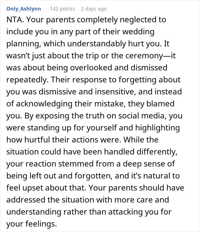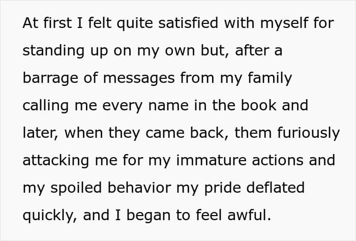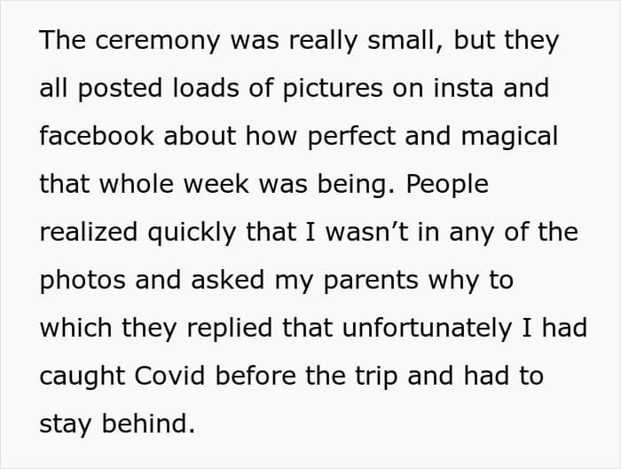 “I felt sort of triumphant after that because of the people who commented on my post saying it was outrageous for me to be excluded but that quickly faded away when my parents and siblings started calling telling me I ruined the whole trip and the wedding and they’ve been like this since I made the post,” she admitted.