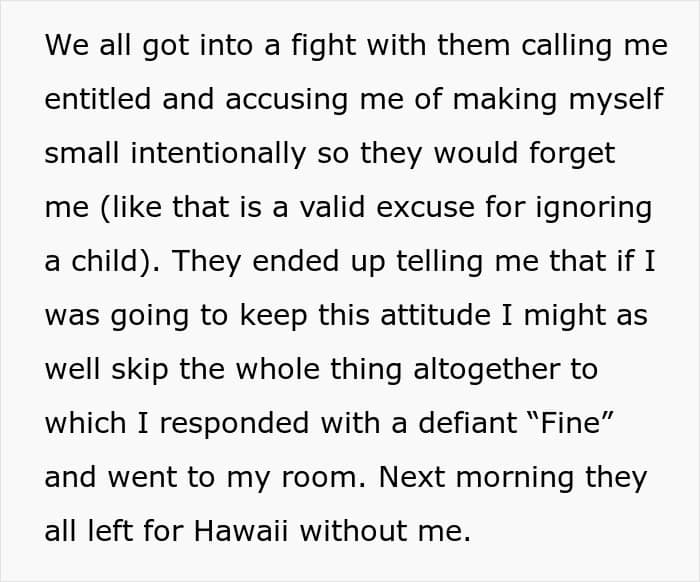 “When my parents returned they, and my siblings, berated me for a good while. They accused me of being jealous, a brat, of being too sensitive,” the teen told We. She added that her family “tried to defend themselves by putting the blame on me, for staying quiet before the trip, for not fighting harder to get there and for causing unnecessary drama with my post.”