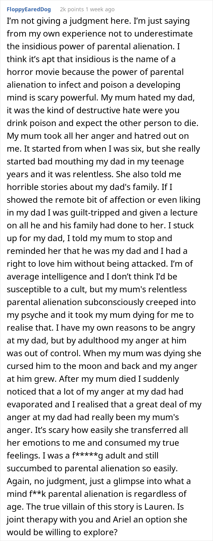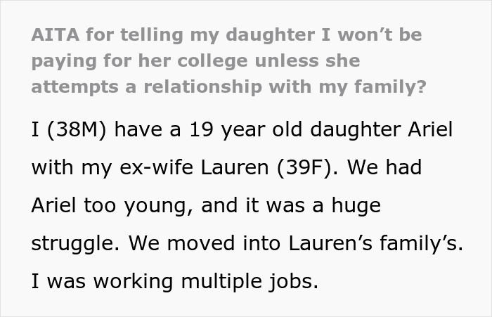 So the Original Poster is now just under 40, and the daughter from his first marriage is 19 and just started college. The OP and his ex-wife Lauren got married at a very young age, and when their daughter Ariel was born, they faced a lot of problems, but tried to stick together.