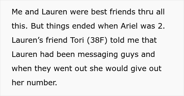 When the girl was two years old, Lauren’s friend, Tori, told the OP that his wife was actively texting other men. The OP checked her phone and found out it was true. After a family scandal, the husband demanded a divorce, and although Lauren offered to reconcile, they still broke up. The custody was split, although the father-in-law even offered the OP money so that he would refuse.