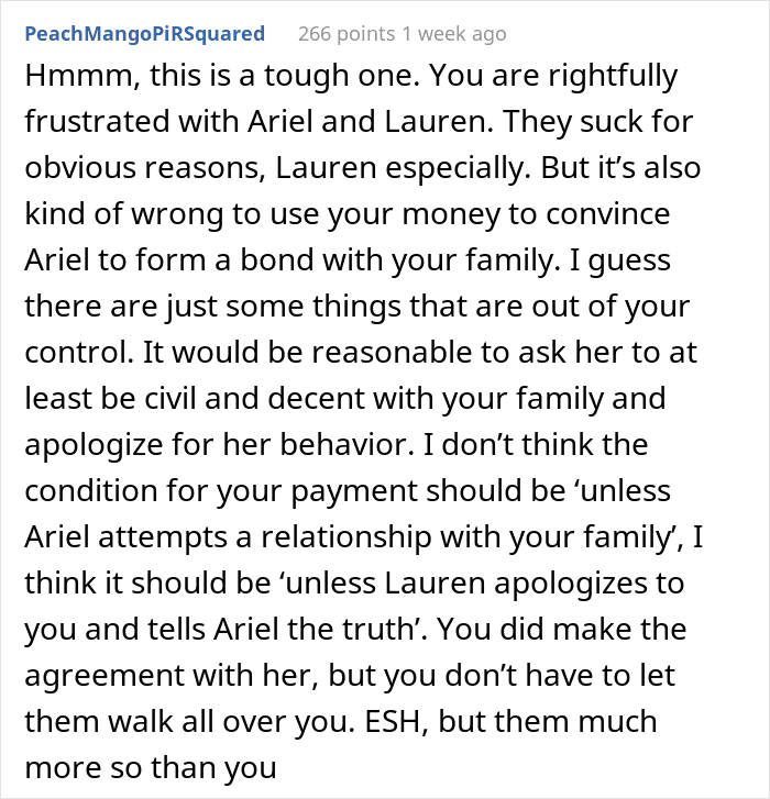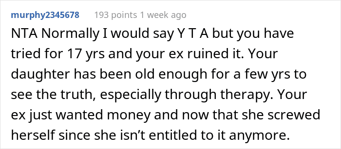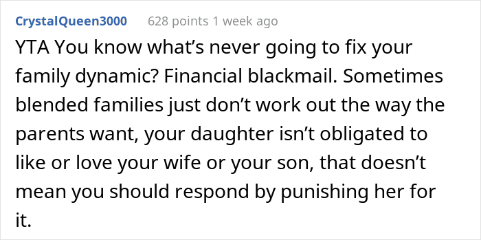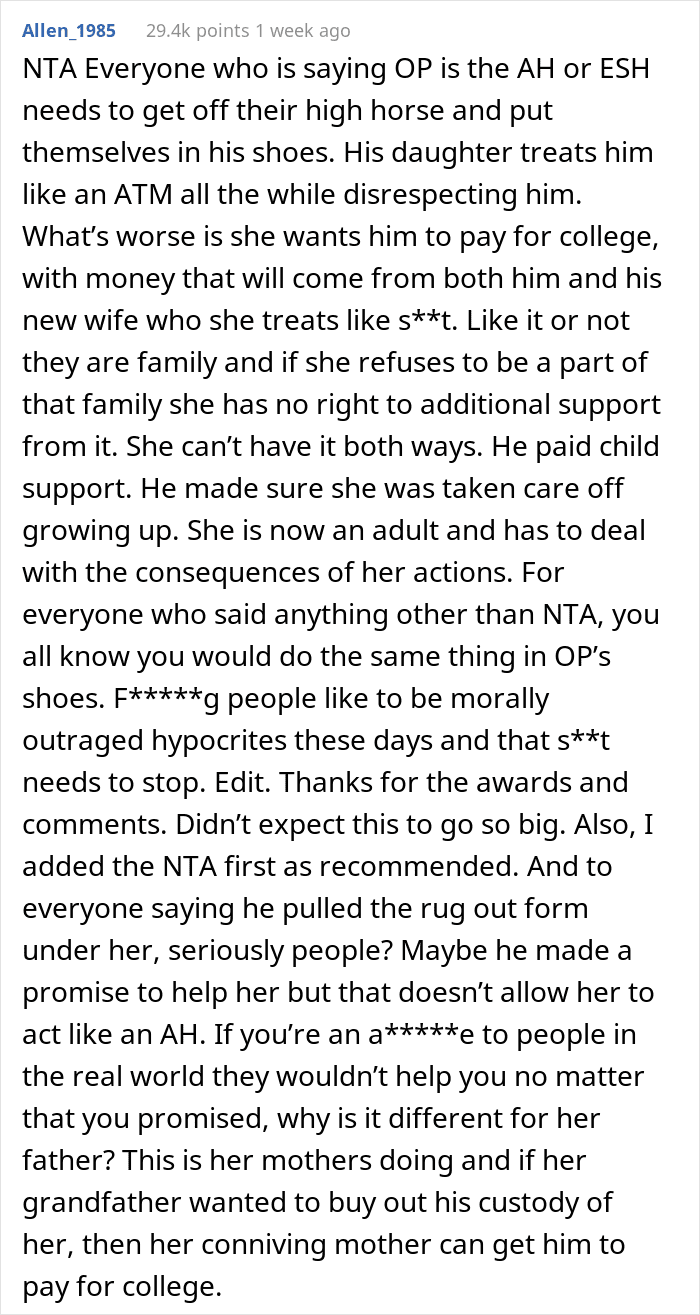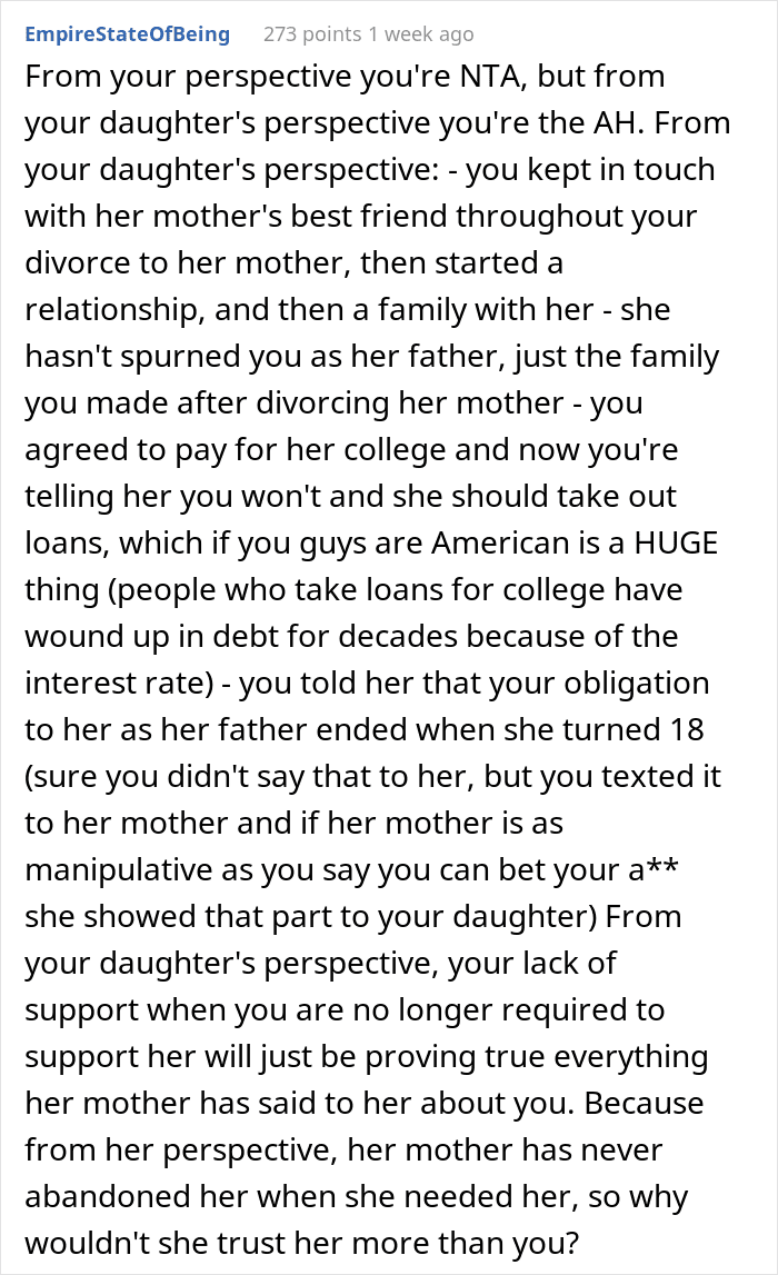 As for the other people in the comments, they can’t help but point out that it was very unwise for the OP to marry Tori – even if some time after his divorce. As a result, it was the OP’s actions that largely predetermined the response of Lauren and his daughter, so now the man needs to decide something – and it is far from certain that refusing to fund his daughter’s college is a really good decision.