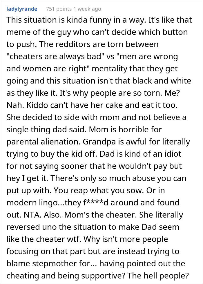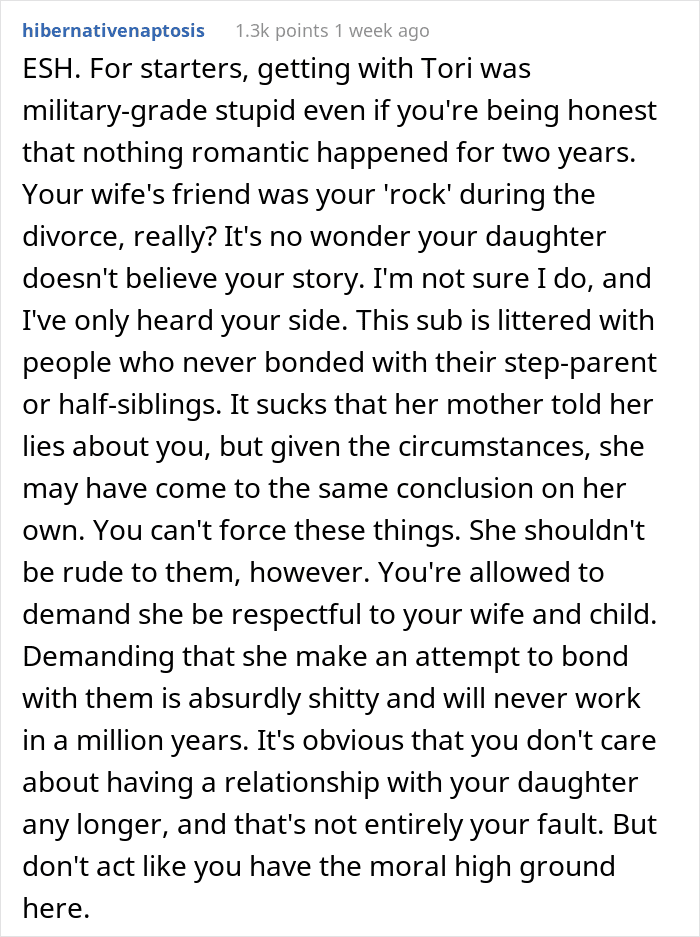 We must say that the opinions of redditors in this situation were split. Some believe that the OP is completely innocent of anything, but simply the daughter does not respect him, because her mother turned her against her father and his new family. In this case, commenters simply advise the man not to be too categorical.