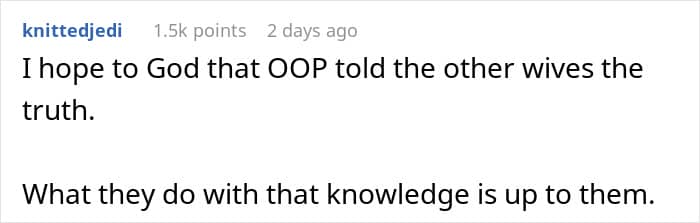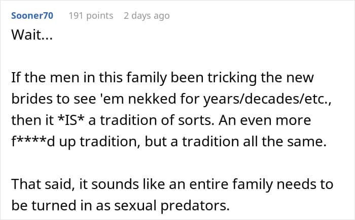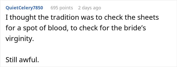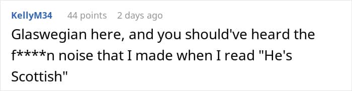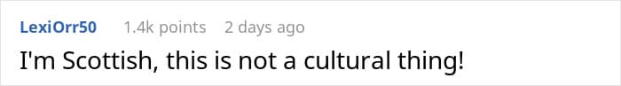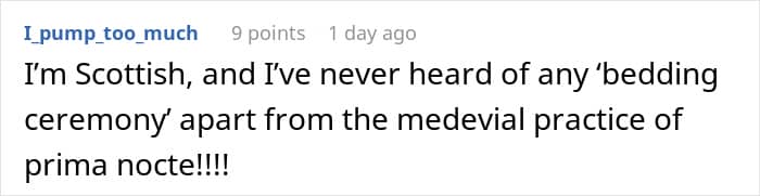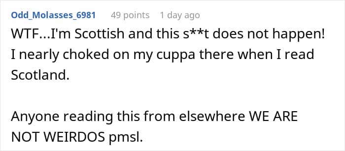 And OP was not alone in thinking that. Many confirmed that it’s not really a thing among Scottish people—OP’s fiance was apparently Scottish. Some were afraid to think how the other wives had to go through it—and hope OP told them about the truth.