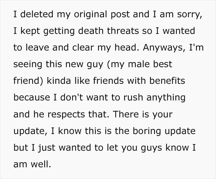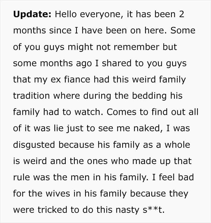 Roughly 2 months later, the author of the original post provided an update confirming that the fiance is now an ex