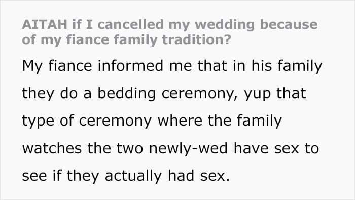 A woman on Reddit was at a bit of a loss when she found out that the man she was going to marry belongs to a family with a very weird tradition. Apparently, there’s a tradition called “bedding” in which, essentially, the family of the newlyweds watch them do it like on the Discovery channel.