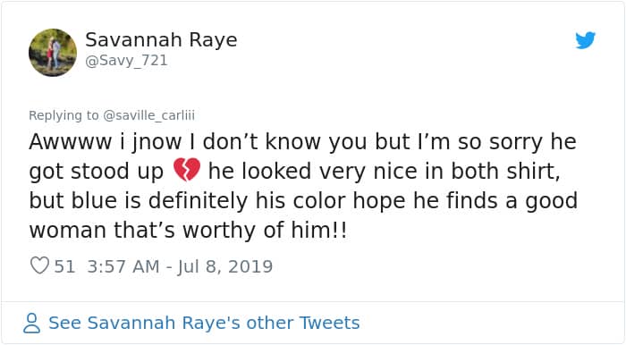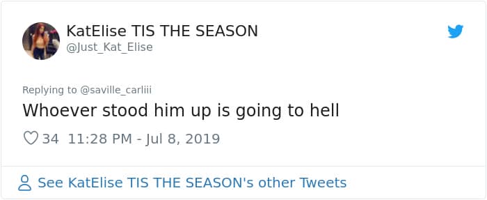 When someone wrote, “Dinner on us if he brings a date,” Carli replied, “Considering he got stood up, I’m sure he’ll be glad to hear it!!” The fact that Jeff got stood up wasn’t sitting right on many people. “Whoever stood him up is going to hell,” someone even tweeted.