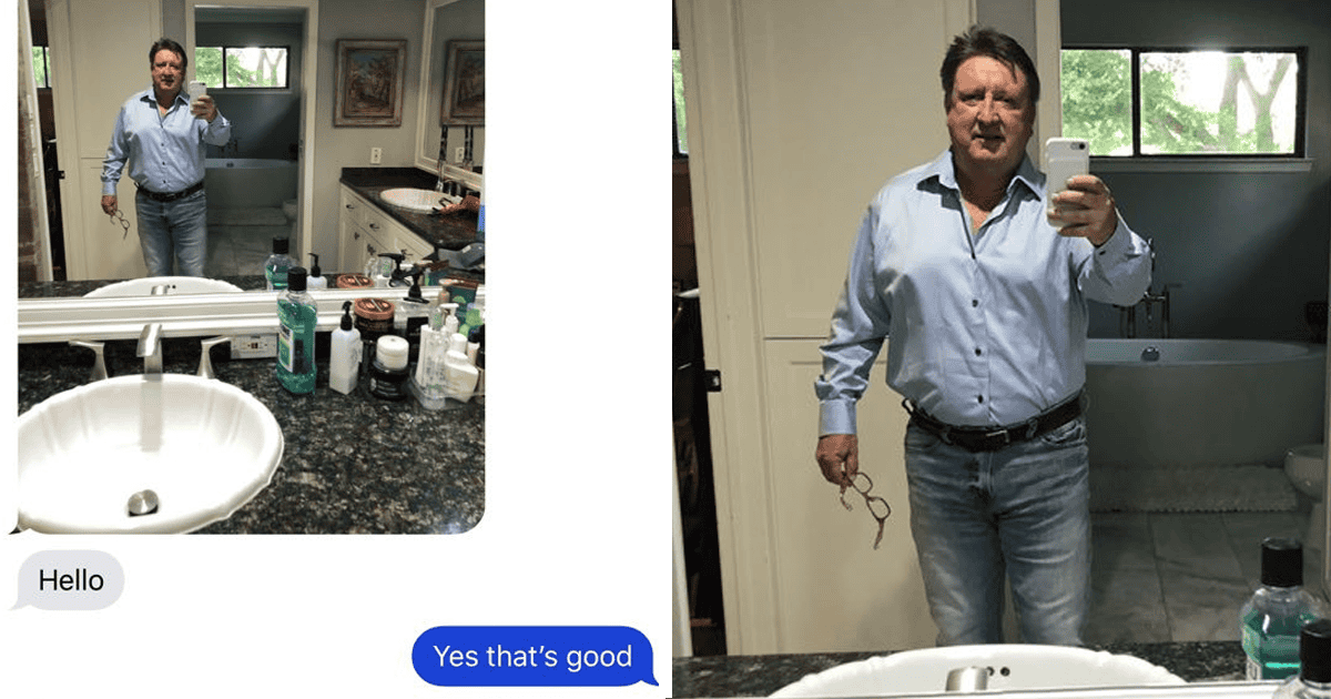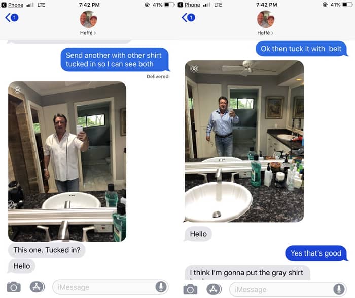 The photos posted by Carli show her dad trying on two different shirts, with him texting “Hello” each time his daughter, presumably, took too long to reply.
