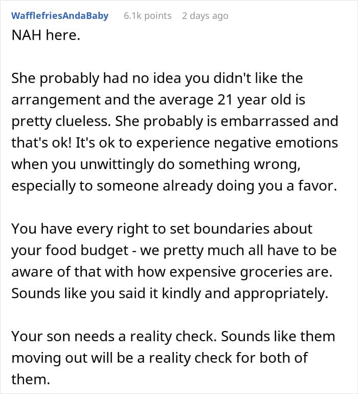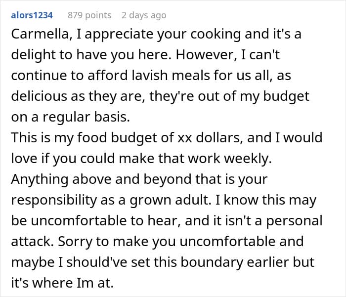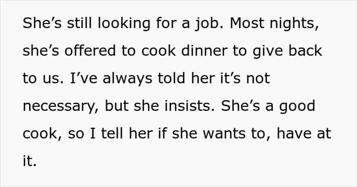 However, some situations can be tricky. Here, a mother allowed her son’s partner to live with them until she found a place of her own. In turn, the young woman offered to cook meals for the family. Things became slightly uncomfortable when the girlfriend refused to heed the mom’s reasonable request.