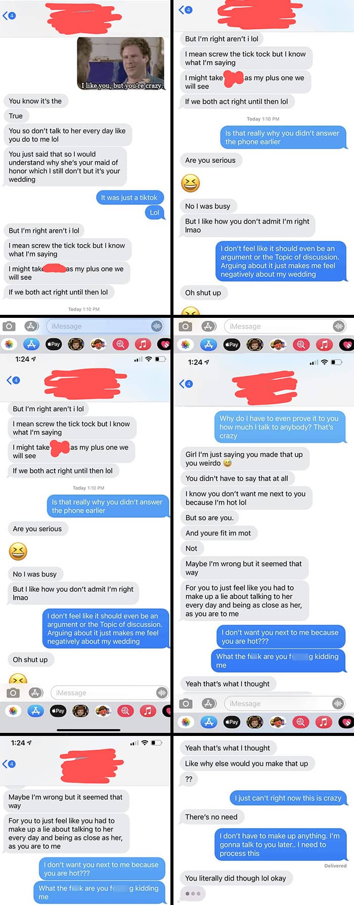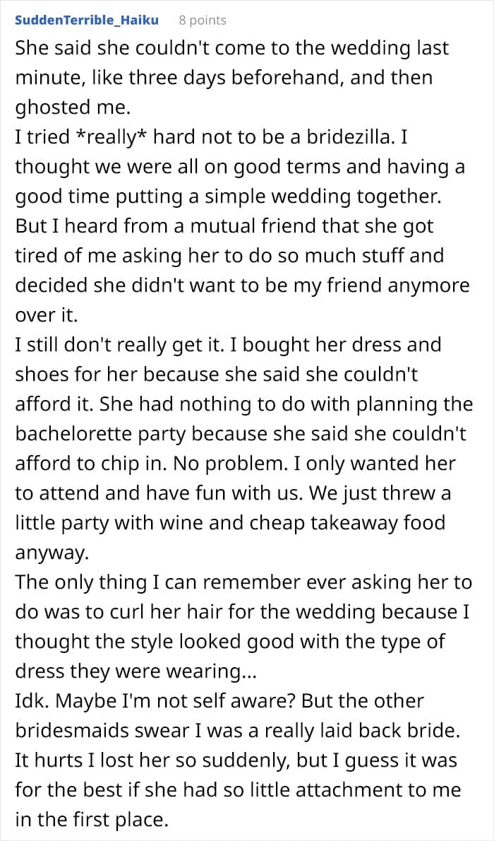 About a month or so later, I confronted her about it. I told her that I felt like our friendship was dwindling and I didn’t understand why. I told her how I felt and that if it was something I had done that I’d do my best to amend it. She flipped out saying “she wasn’t jealous but she just knew what was right and wrong”, inferring that her relationship was “better” somehow. It was absolutely mad. I asked her if she even wanted to be in the wedding at this point. She said she did, she really did and never even apologized. Looking back on this situation I should’ve never asked her in the first place. She suddenly went cold-Turkey ignoring me. I finally asked if she and I could talk and she acquiesced. I “fired” her from being a bridesmaid. I felt horrible about it. I truly did. At the same time, I couldn’t handle all the straight up bullying I was taking. I never once yelled at her, never once called her any names. She told everyone I yelled at her and called her a b***h. 😂 Even if I had, that would’ve been nothing compared to the s**t I endured from her.