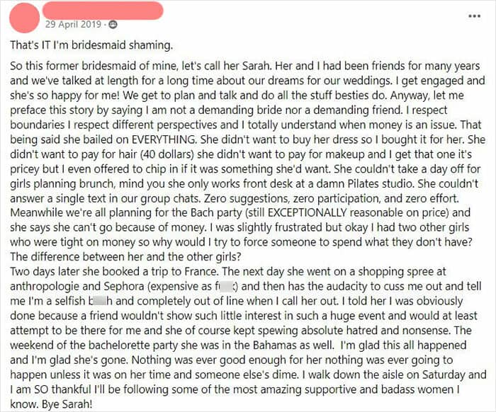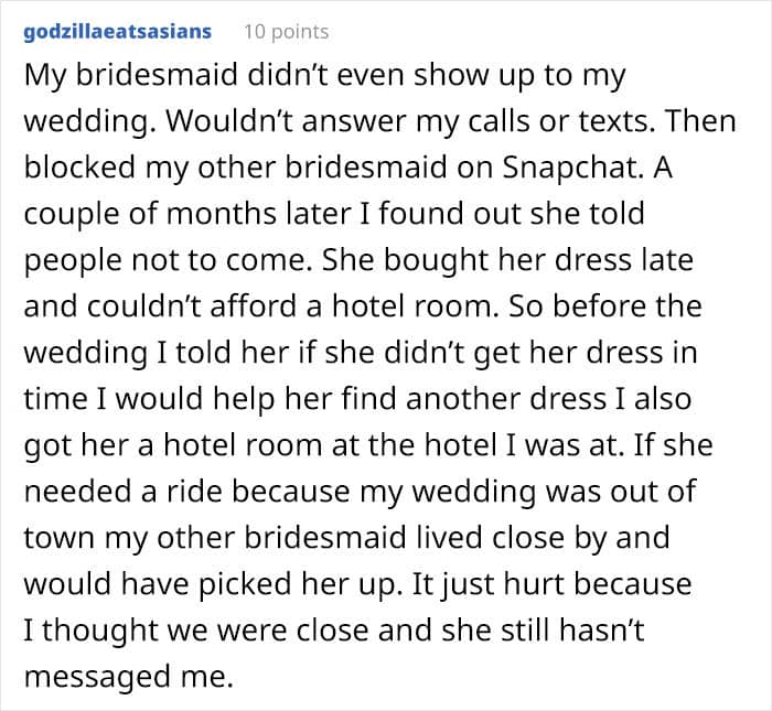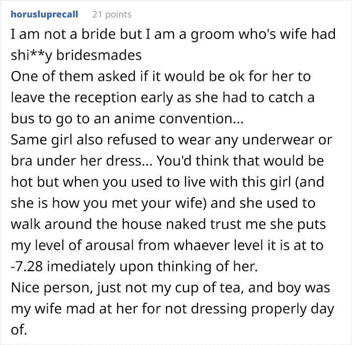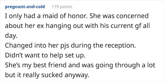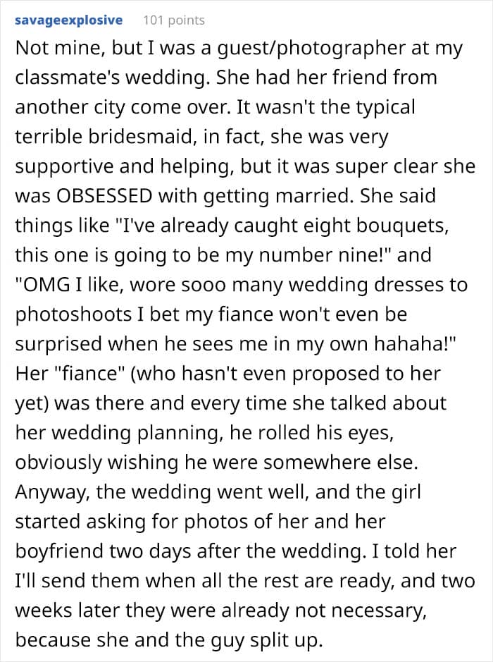 You are probably familiar with the corner of Reddit called “Wedding Shaming” where people gather to roast failed weddings, from tacky dresses to indecent behavior. With 312k members, it’s Reddit’s destination to blow off that steam if you just returned from a wedding you’d much rather have missed. This time, brides are sharing the worst bridesmaid stories that happened during their weddings both on the subreddit and this Ask Reddit thread.