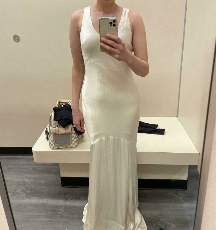 #18 Groom’s Sister Is Told Prior To Wedding That Her Dress Choice Is Inappropriate. Sister Replies She Will Never Speak To Her Brother Again If He Goes Through With The Wedding. She Is Uninvited From Wedding, Then Shows Up To Wedding In This Off-White Cocktail Dress.