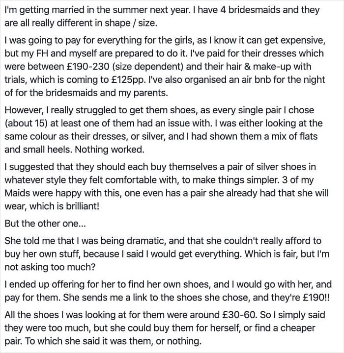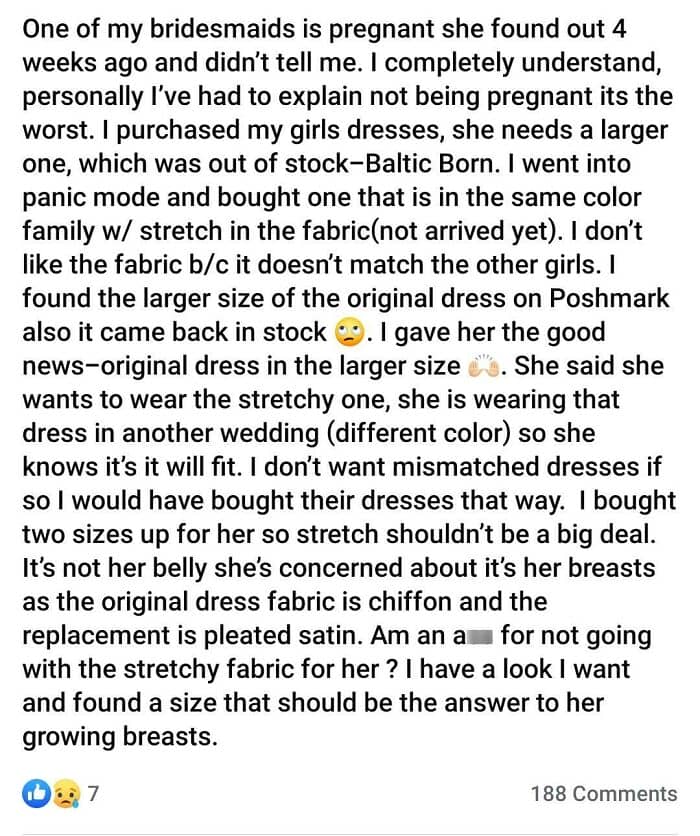 #32 When A Dress Is More Important Than Your Pregnant Friend’s Comfort. The Comments Were Full Of “Your Wedding, Your Choice; Kick Her Out Of The Bridal Party” The Willingness People Have To Potentially End A Friendship Over A Dress Is Appalling. Yta