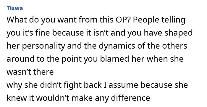 It could’ve ended as just a joke, but the OP tried to figure out what those words meant—and what she heard literally shocked her. It turned out that both her husband and the other children always believed that their sis was, in fact, the mom’s scapegoat—and the other siblings readily shifted the blame for all sorts of minor infractions to her. Over time, she came to terms with it and took the blame herself every time.