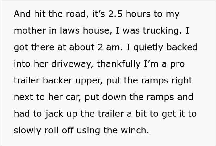 The next morning, his malicious mother-in-law woke up to the full-scale redneck delivery, lost her mind, and called the cops. But the officer who responded quickly realized she was completely unhinged and shut the whole thing down. She didn’t speak to OP and his wife for 6 blissful months, something he still considers a win-win scenario.