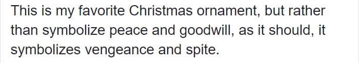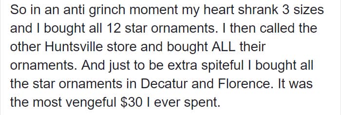Now, there is a time and a place for haggling, I’m thinking the souks of Marrakesh, or perhaps a thrift store. Not in a department store, and not over a quarter, for something you won’t be needing for another year anyway. Needless to say, Sarah and the entitled woman quickly got in an argument about the golden stars, and it left Sarah with a thirst for retribution. What was to follow is a brilliantly executed act of revenge, totally petty and unnecessary, but wonderfully satisfying all the same. Scroll down to read why Sarah now adorns her tree each year with her ‘Star of Vengeance,’ and let us know what you think in the comments!
