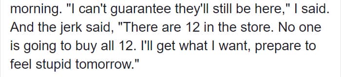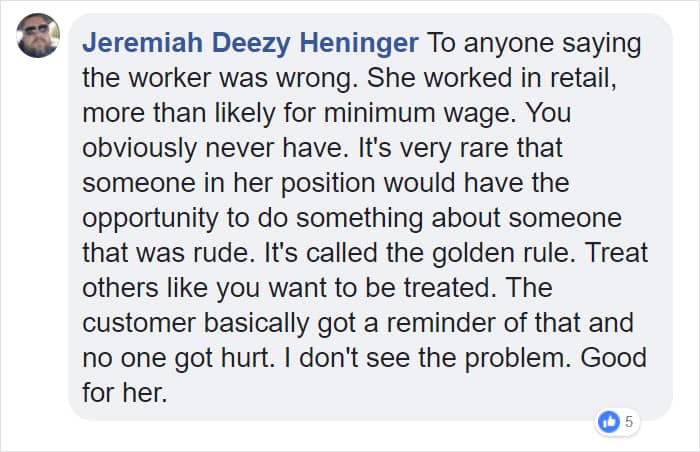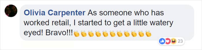“I think my story resonates with alot of people because: 1. So many of us have worked retail, so we get it, and 2. It’s nice when you can reclaim your power when someone has made you feel powerless. Sometimes the little guy does win. The reaction has been overall good, but I recognize it’s not to everyone’s taste. If it makes retail workers feel a little more worthy of respect and customers a little nicer this holiday season it is a win for everyone.”