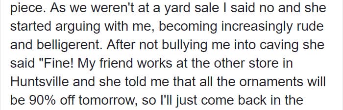 A long and exhausting Christmas period was finally over, and her shop was selling off some cute Christmas ornaments on the cheap. Everybody loves a bargain, and these lovely golden stars were going for a steal at only 50 cents a pop. However, this paltry price proved to be still too much for one woman (who didn’t appear to be lacking a penny or two), and she demanded a further discount, down to 25 cents.