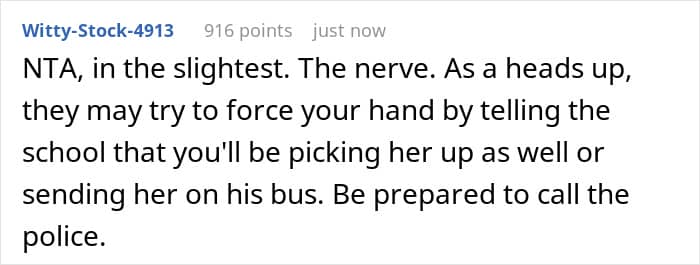 Still, drama found a way back in. Her ex and his now-wife once demanded she supply baby gear for their child because they “couldn’t afford it,” even calling her stuck-up for refusing. After that, communication moved strictly to a parenting app, and OP only responded when absolutely necessary. Life stayed peaceful… until recently.