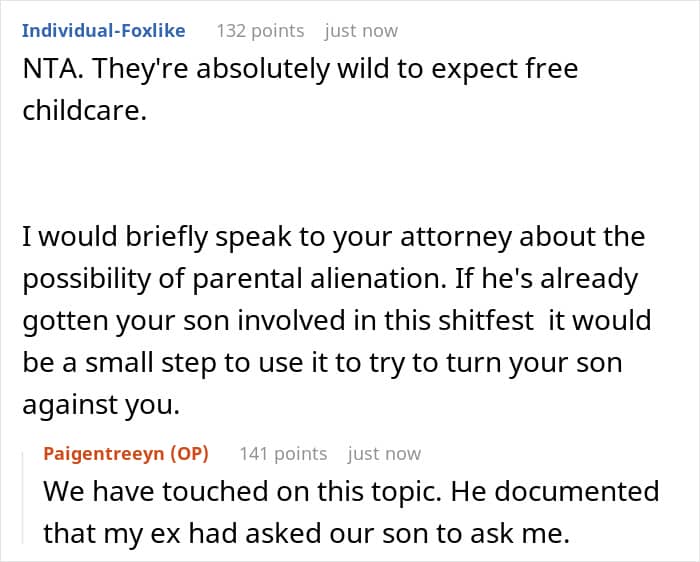 Things escalated fast: guilt-tripping, their son being used to pressure her, threats to show up at her door, and even an attorney’s half-baked attempt to force childcare duties on her. Her lawyer shut it down immediately but now OP’s left wondering if standing her ground makes her the villain, or simply a mom protecting her boundaries.
