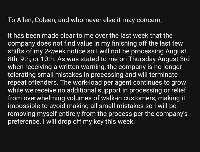my boss pissed me off just the right amount and I decided that was my last straw and I wasn’t going to continue to be treated badly by my SM and the company as a whole. Called out of my next two shifts and then this morning before I left for a week vacation, I dropped off this cutesy resignation letter aka my “F you” to my boss.