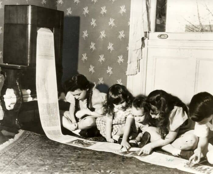 In 1938 the first wireless newspaper was sent from the New York radio station WOR, which could be received in the living room. Photo: a number of children read the children's page of a radio newspaper from Missouri. National Archives / Spaarnestad Photo / Het Leven / Photographer unknown, SFA022813039