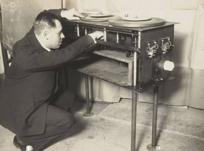 The Loetafoon is a gramophone record player that is connected to a film projector. A mercury contact on the film indicates exactly when the needle should be on the record to start the sound film. The device is supplied with a single, double and triple turntable.