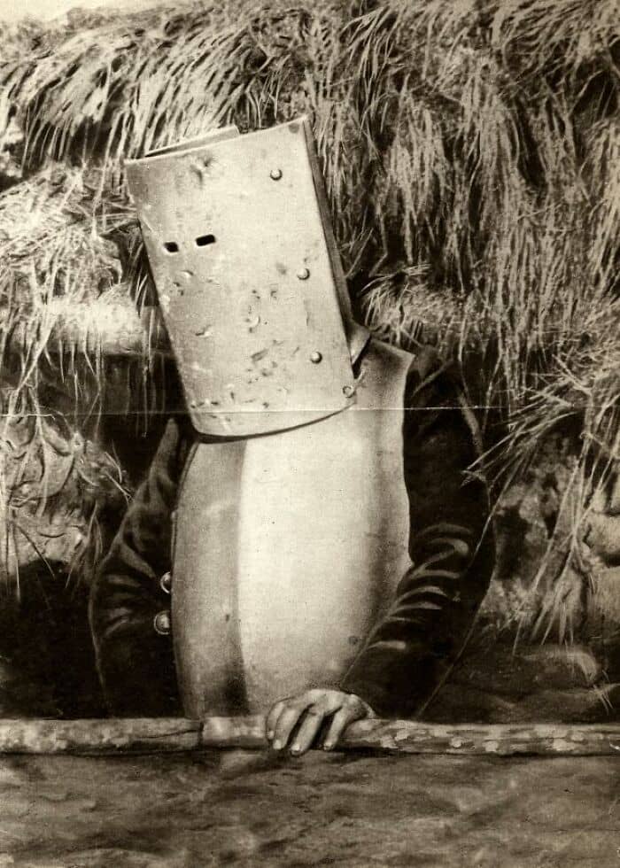 #21 A French Soldier Wearing A Kind Of Armour As Protection Against Flying Bullets Above The Trench. First World War, France, 1915