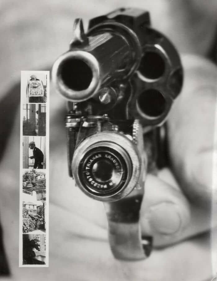 #37 Revolver Camera: Front View Of A Colt 38 With A Built-In Camera That Automatically Takes Pictures When The Trigger Is Pulled. On The Left: A Series Of Six Images Taken With The Revolver Camera. New York, 1938