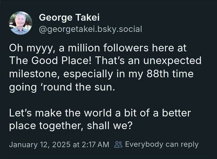 #12 George Takei Becomes The Second Person To Reach A Million Followers On Bluesky!