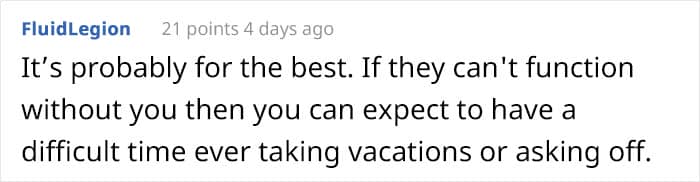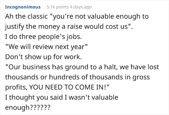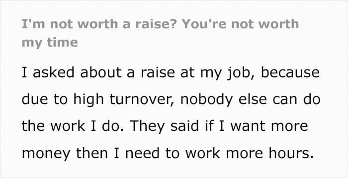 This is what happened when one Redditor, W12ZY, rightfully requested a raise because “due to high turnover, nobody else can do the work I do.” The company refused and said “if I want more money then I need to work more hours.” So the Redditor has had enough: “Today I didn’t go in and now they’re calling me in a panic because they can’t run properly without me there.”