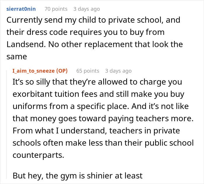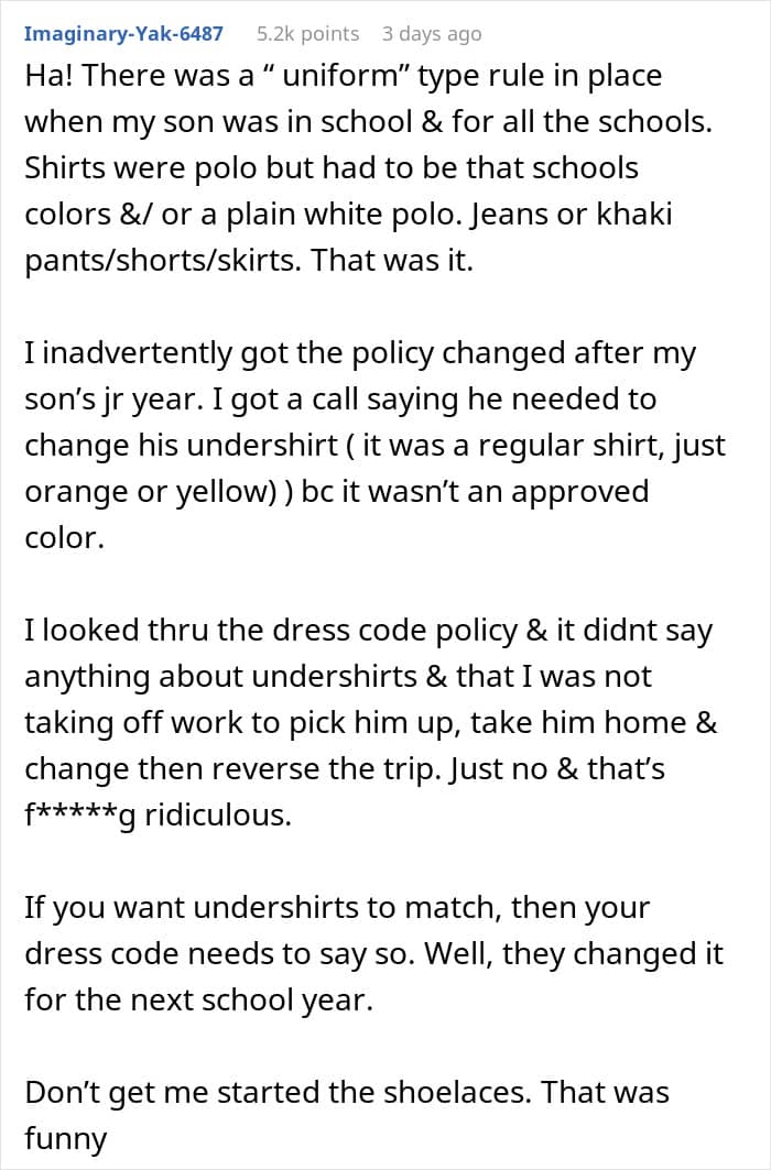 A mom had to deal with the strict dress code of a private school her son attended, something she eventually got fed up with. After finding a loophole in the rulebook, she maliciously complied, much to the displeasure of the school administration.