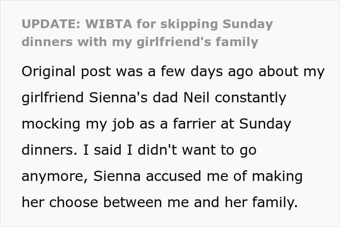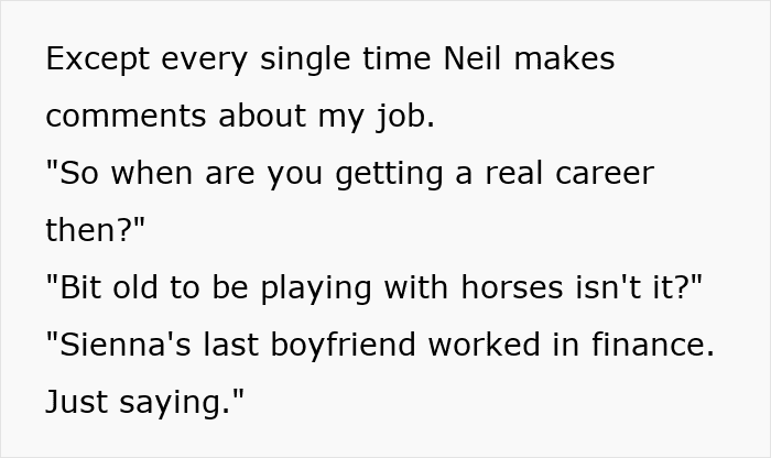 The thing is, OP is a farrier; basically, a person who does horse hoof care, and gets paid quite decently. However, Neil absolutely hates this field, but he barely knows that it requires skill and earns way more money than any office job. That’s why the jabs just kept coming at OP. He was also mad that Sienna never once stood up for him, and said that he didn’t want to go for dinner anymore.
