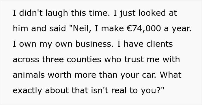 She begged him to give it one more try and even said that she would say something to her dad. Well, he relented, but wasn’t really surprised when she stayed silent this time as well. He decided that enough was enough. OP finally clapped back, reminding Neil that he earns €74,000 a year (roughly $85,000), has his own business, and looks after horses from 3 counties worth more than Neil’s car!