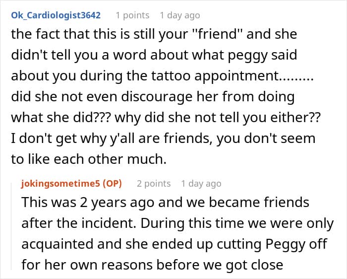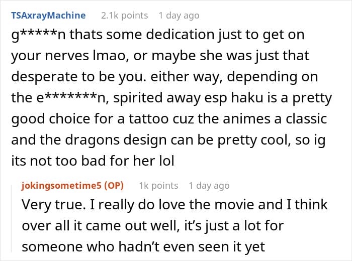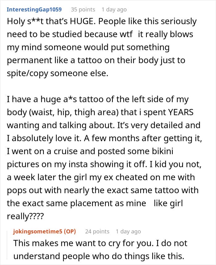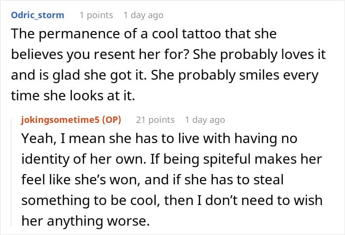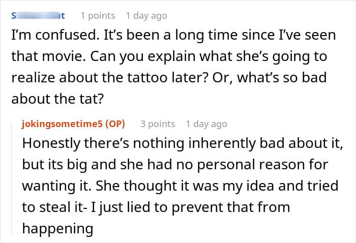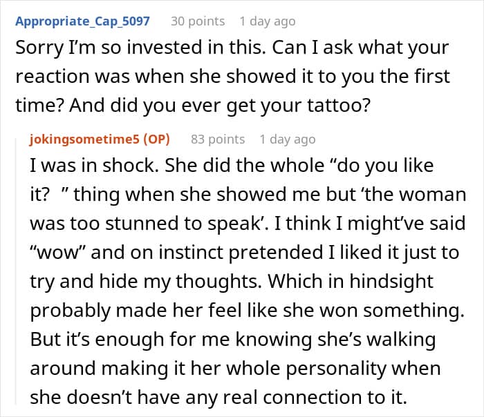 The post itself ended up gaining a lot of attention alone, so we wanted to hear her thoughts on that. “I wasn’t expecting so much traffic within such a short amount of time. It’s hard to keep track of all of the questions and comments but I think people found it engaging for a couple reasons. One surprisingly common point was that it’s relatable. A lot of readers have experienced similar situations. I was honestly shocked to receive DMs from Redditors who’ve had their tattoo ideas stolen before. Another reason was that it was controversial! Debates were sparked on whether her tattoo was cool/not and whether or not I was in the wrong. I was also called into question on if I had used AI for “karma farming” which I didn’t know about until a quick google search enlightened me, which, no, I did not.”